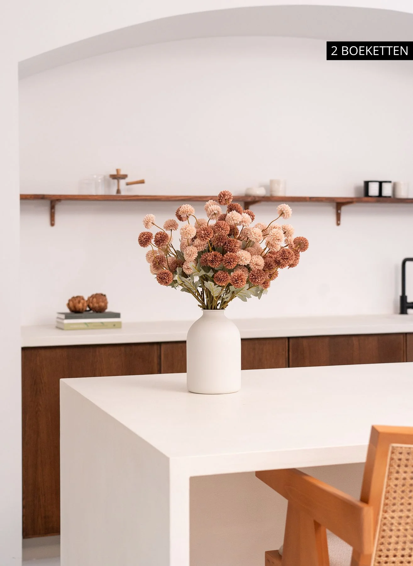 De volle bloemhoofdjes en verfijnde afwerking zorgen voor een levendige maar elegante uitstraling in elke ruimte.
