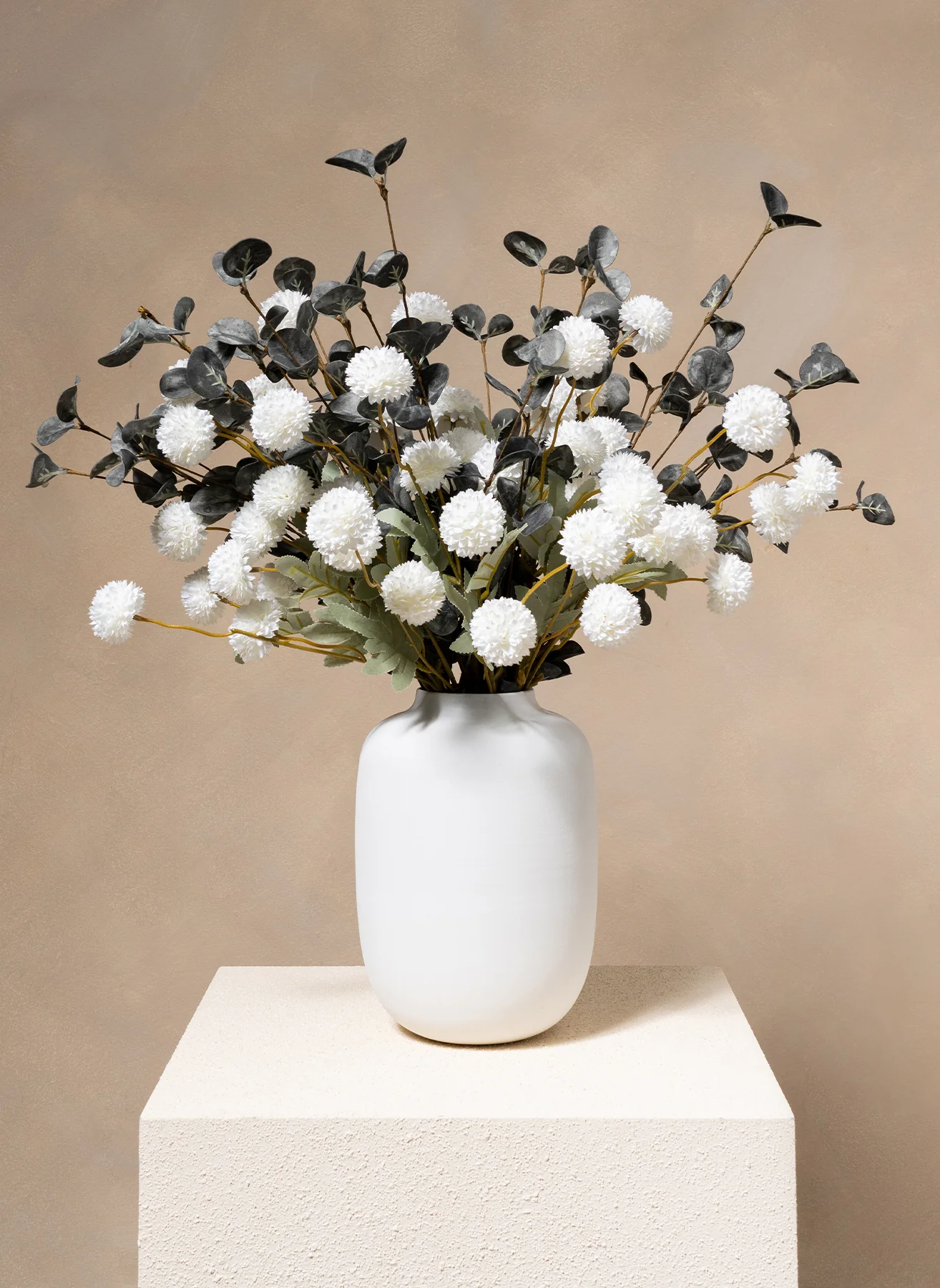De combinatie van onze Kiku bloemen en Eucalyptus zorgt voor een elegant, natuurlijk geheel met een verfijnde balans.
