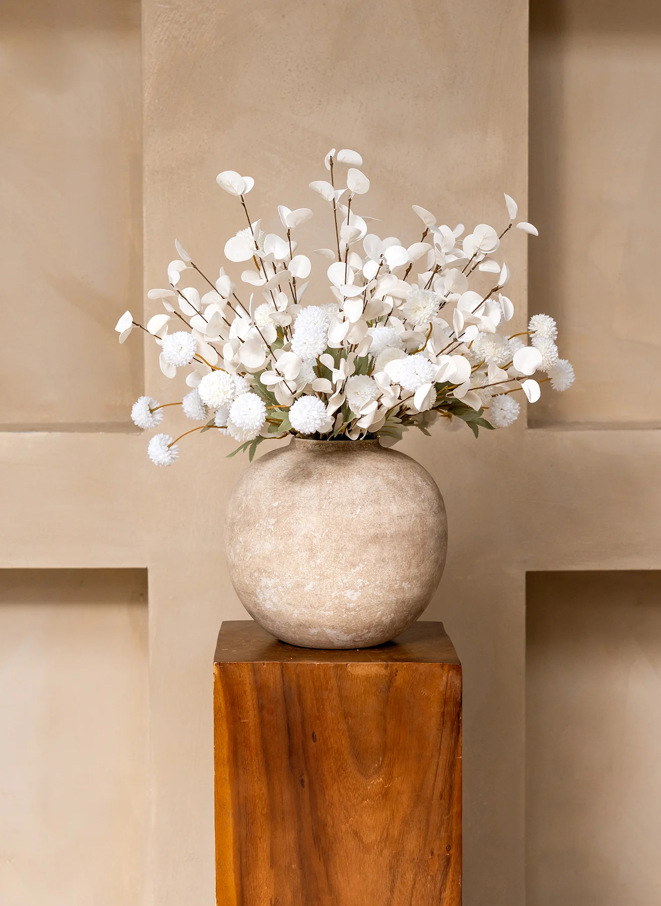 De combinatie van onze Kiku bloemen en Eucalyptus zorgt voor een elegant, natuurlijk geheel met een verfijnde balans.