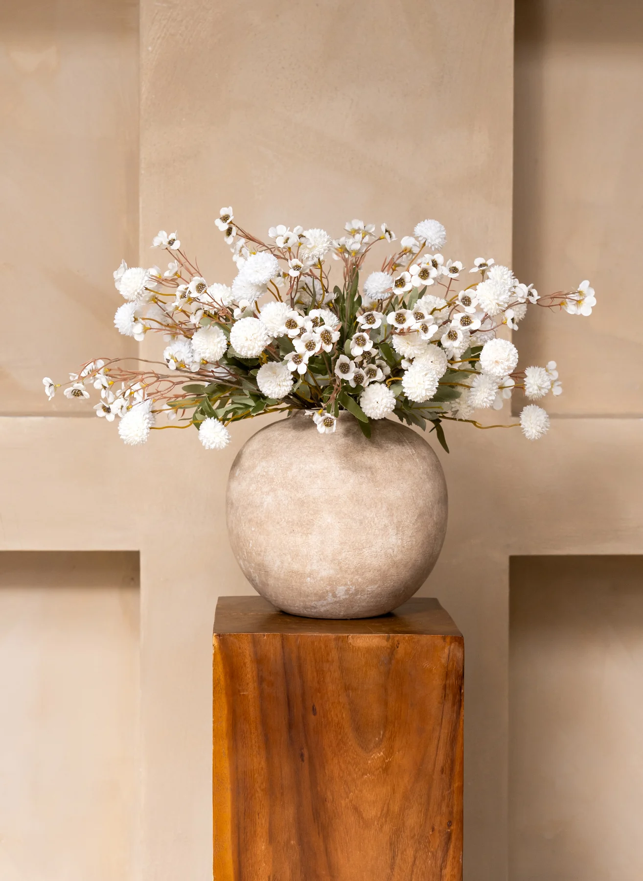 De combinatie van 10 stelen zijden wax bloemen en 10 stelen kiku bloemen zorgt voor een harmonieus geheel met volume, kleur en een natuurlijke uitstraling.